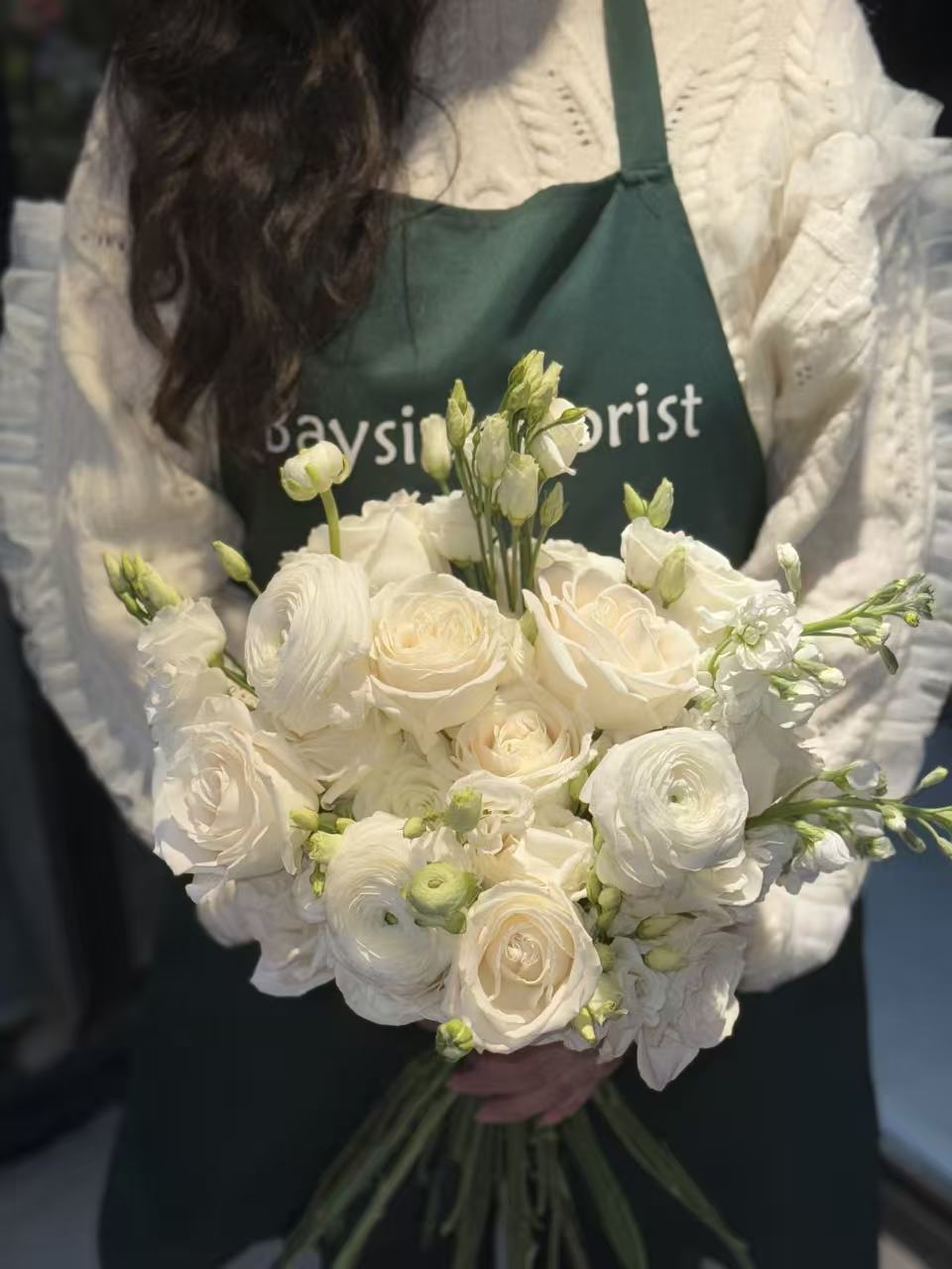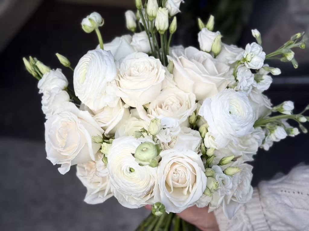 This hand-tied bridal bouquet features a refined mix of roses, ranunculus, lisianthus, and stock, complemented with delicate seasonal blooms for a soft and elegant look. The all-white palette creates a timeless and graceful design, perfect for a classic wedding style. Due to seasonal availability, some flowers may be substituted with similar blooms of equal or greater value while maintaining the overall style and color palette.