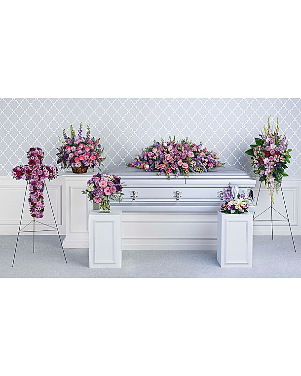 This sympathy set includes one standing wreath and three elegant standing sprays.