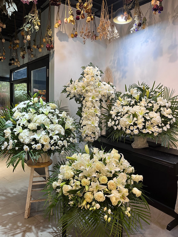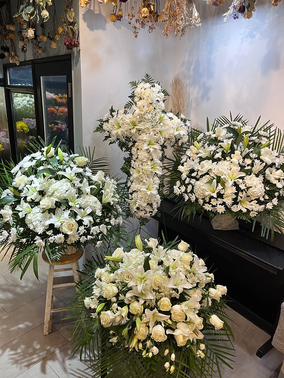 The arrangements feature white lilies, white roses, carnations, daisies, and seasonal white flowers accented with lush greenery, creating a graceful and peaceful tribute.