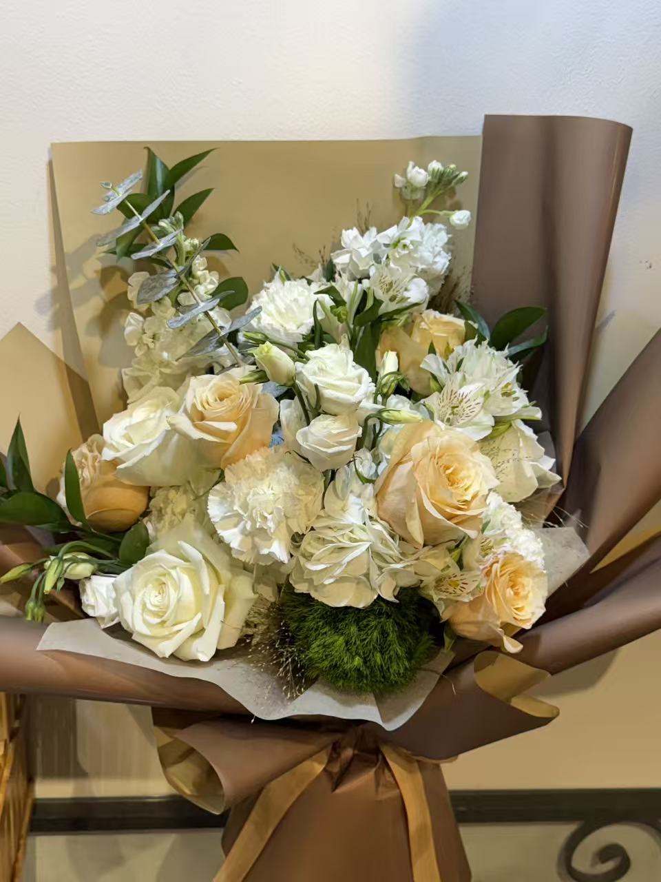 This hand-tied bouquet features a fresh mix of roses, carnations, lisianthus, and seasonal accent flowers, complemented with soft greenery for a clean and elegant look. The blend of creamy white and soft neutral tones creates a refined and timeless design.