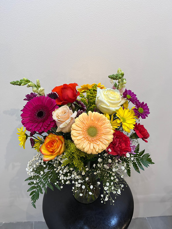 This vibrant vase arrangement features a cheerful mix of roses, gerbera daisies, spray roses, daisy mums, baby’s breath, solidago, and seasonal greenery. The lively combination of bright pink, yellow, peach, and purple blooms creates a playful, garden-inspired look full of color and texture.