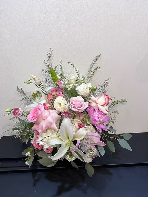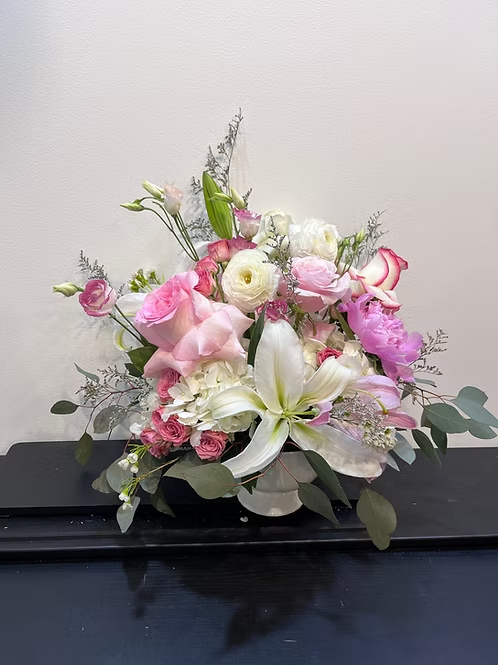 An elegant arrangement featuring pink roses, white lilies, spray roses, lisianthus, and delicate seasonal accents with fresh eucalyptus. Designed in soft blush and ivory tones, this piece brings timeless beauty and graceful charm to any special occasion.