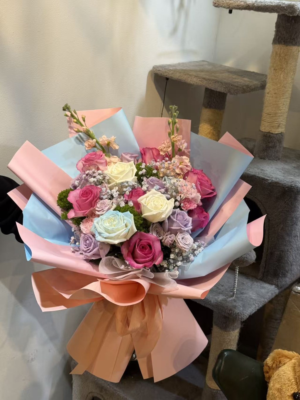 This hand-tied bouquet features a fresh mix of roses in soft pastel tones, complemented with baby’s breath, stock, and seasonal accent flowers, arranged with delicate wrapping for a sweet and charming look. The blend of pink, lavender, and light blue tones creates a playful yet elegant design.