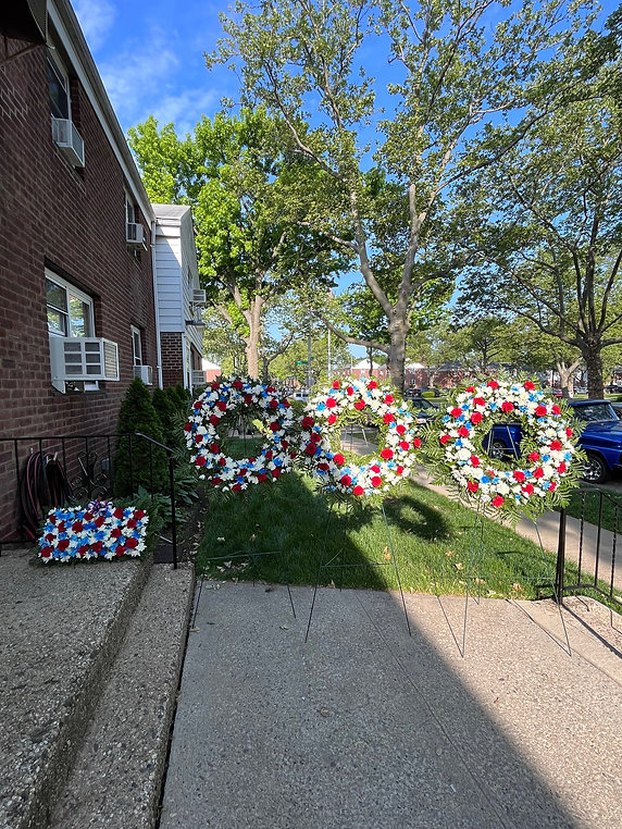This standing wreath features red, white, and blue chrysanthemums accented with lush greenery. The patriotic color palette creates a meaningful and respectful tribute to honor and remember a loved one.