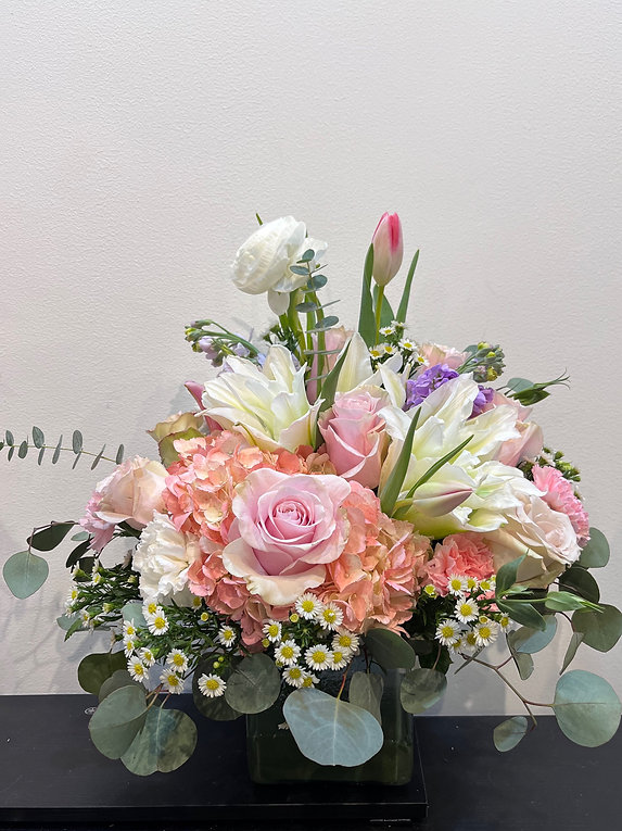 This soft and elegant arrangement features pink roses, hydrangea, white lilies, ranunculus, tulips, stock, and delicate chamomile daisies, complemented with eucalyptus and seasonal greenery. The combination of blush pink, peach, and creamy white tones creates a gentle and romantic look.